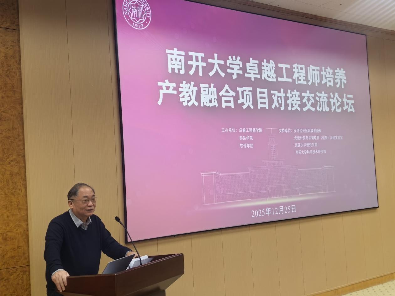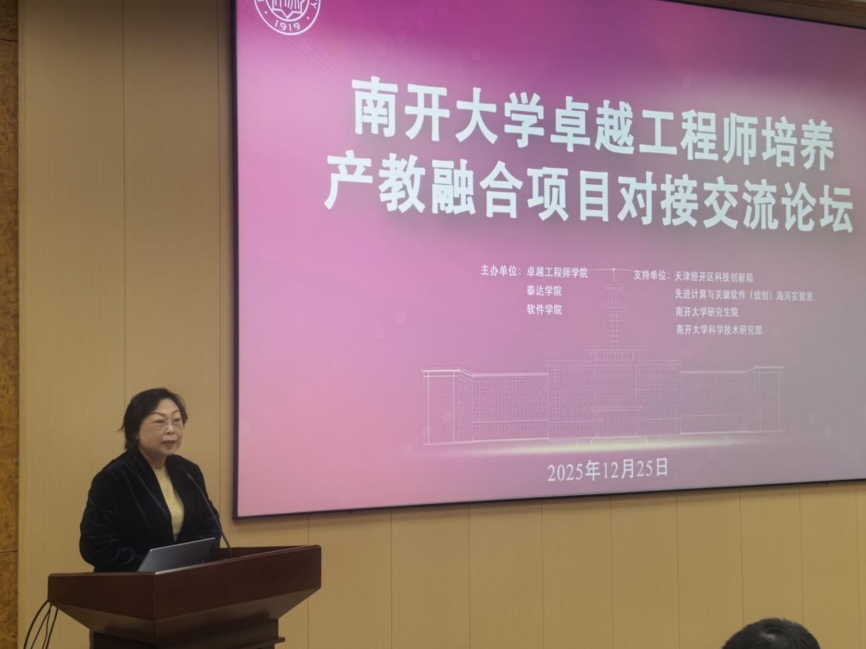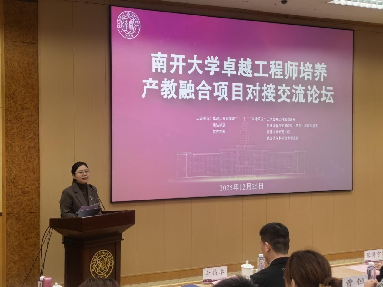 为深入贯彻落实党的二十届四中全会精神,积极服务国家“十五五”规划关于一体推进教育科技人才发展的战略部署,2025年12月25日,南开大学卓越工程师培养产教融合项目对接交流论坛在泰达校区成功举办。本次论坛由南开大学卓越工程师学院、泰达学院、软件学院联合主办,旨在深化产教融合,推动信创领域前沿技术攻关与高层次工程人才培养。活动吸引了来自中国兵器工业集团、中海油田服务股份有限公司、中国汽车技术研究中心有限公司、维沃移动通信有限公司等13家知名企业以及校内6个专业学院的百余位专家、学者与学生参与。论坛由卓越工程师学院党委书记贺文霞主持。